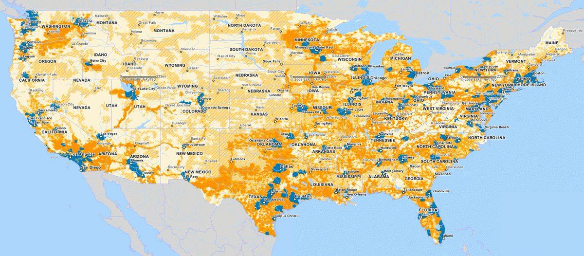 gruber ATP_Tipster1 Absolutely — mostly in the rural west, where Cingular didn’t yet have full coverage. Here’s 2008, found on the internet, with the cross-hatched tan areas representing roaming. (Blue is 3G and orange is Edge)